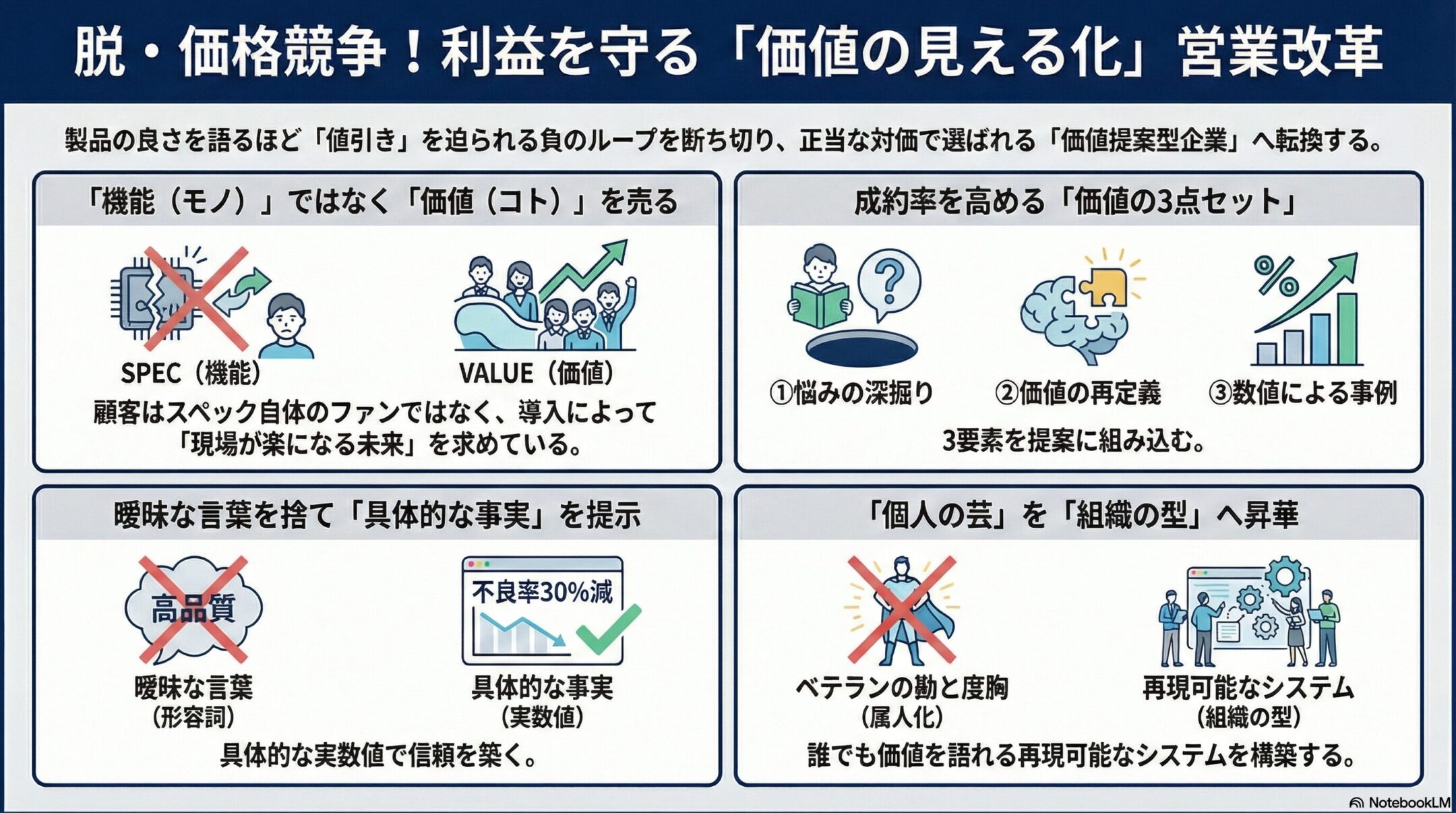 「社長、あのお客さん、あと5%引いてくれたら決めてくれるそうなんです……」 営業担当者からそんな報告を受け、奥歯を噛み締めたことはありませんか? 御社の製品は素晴らしい。社員も懸命に働いている。それなのに、商談の最後にはいつも「価格」という…