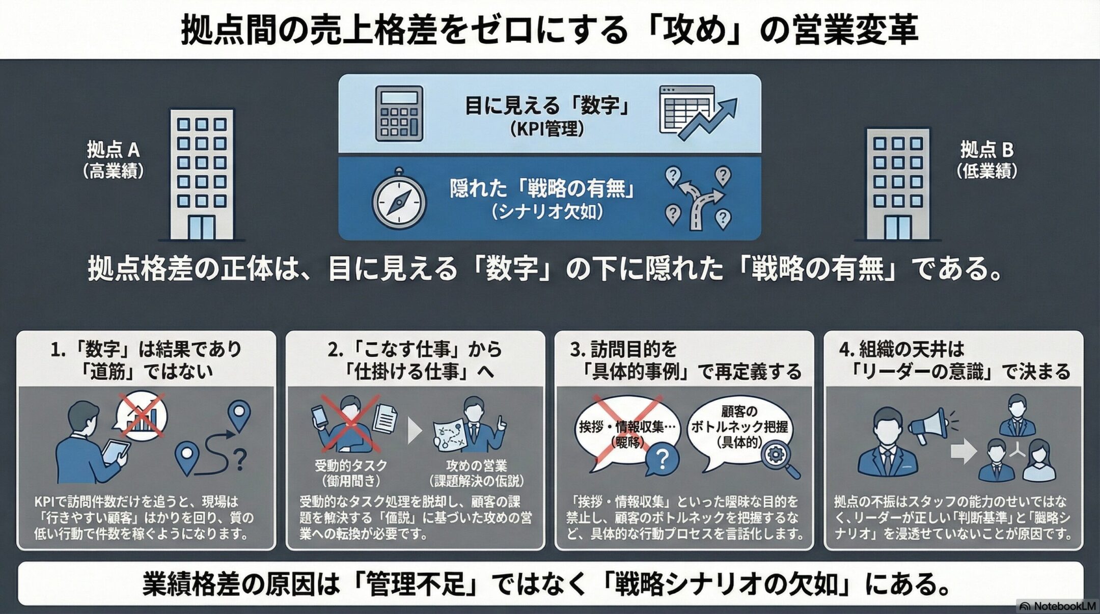 「なぜ、同じ看板を掲げ、同じ商品を扱い、同じ管理システムを導入しているのに、拠点によってこれほどまでに売上の差が出るのか?」 経営者であるあなたは、毎月の会議でグラフを眺めながら、この「埋まらない溝」に頭を悩ませていないでしょうか。 A拠点…
