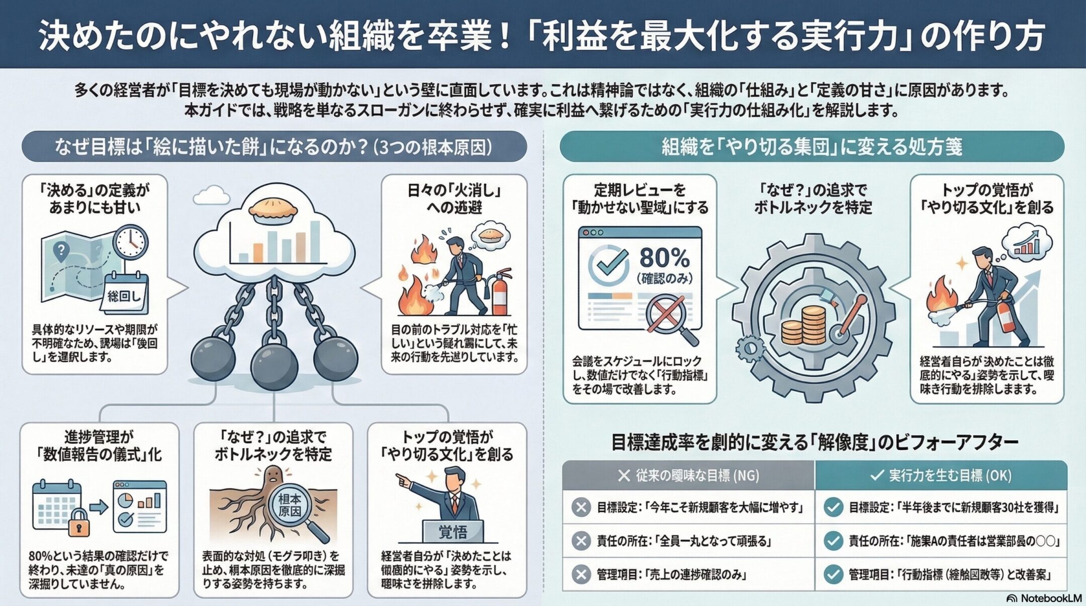 【導入】「気合」の目標設定が、会社を滅ぼす 「今年こそは売上20%アップだ!」「新規開拓に全力投球しろ!」 年始に掲げた威勢の良いスローガンも、数ヶ月経てば日々のトラブル対応にかき消され、現場には疲弊感だけが漂う……。 多くの経営者が、そん…