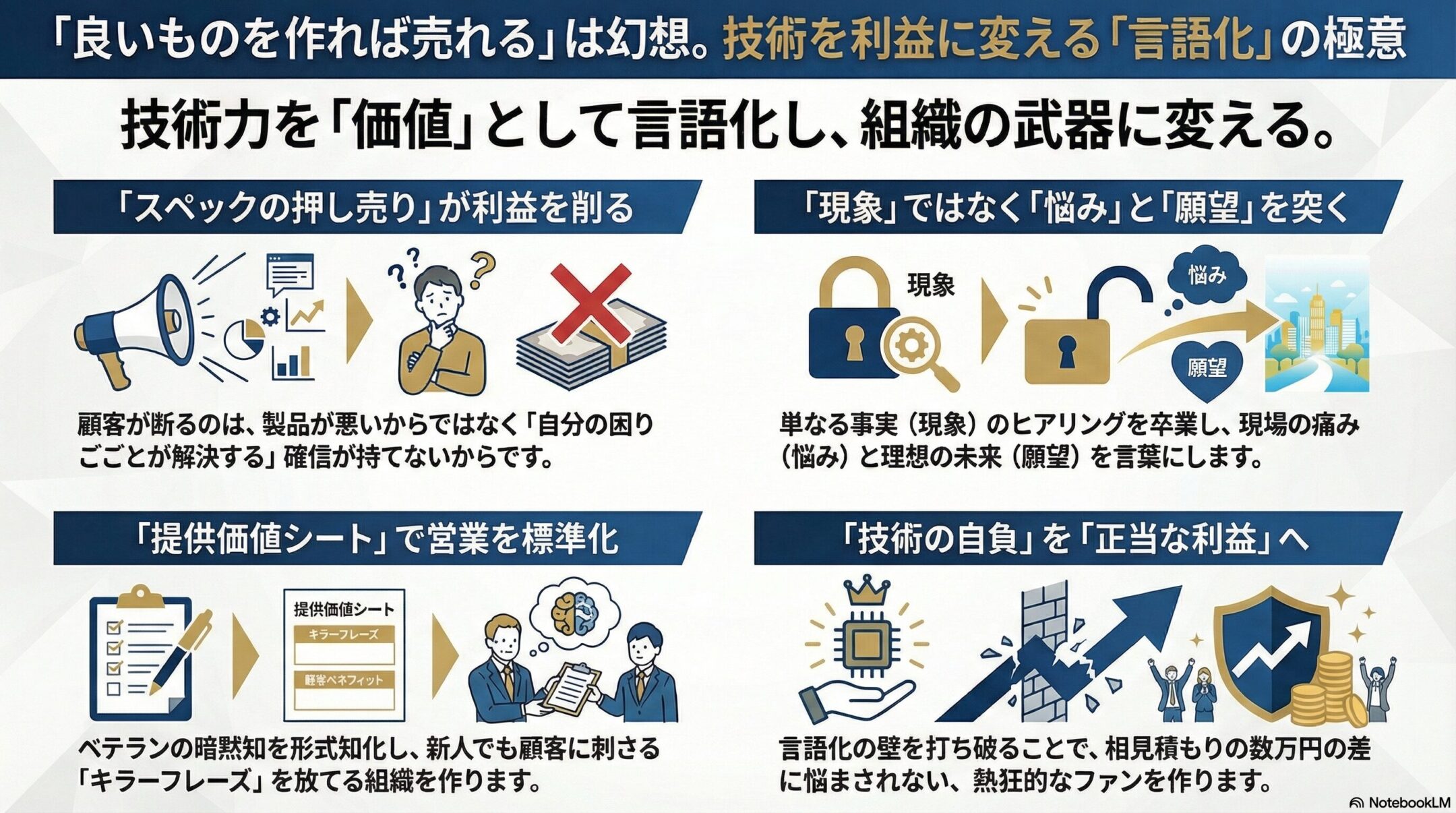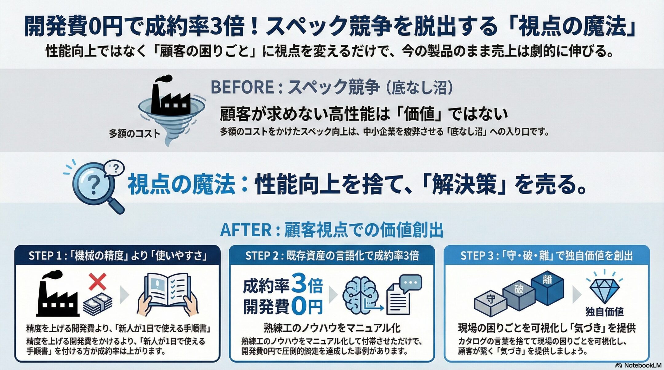 「今の製品はもう古い。競合に勝つには、もっと高性能な新製品が必要だ」 もしあなたが経営者として、売上の低迷を「技術力の不足」や「製品の陳腐化」のせいにしているとしたら、今すぐその考えを捨ててください。 その思い込みこそが、貴社…