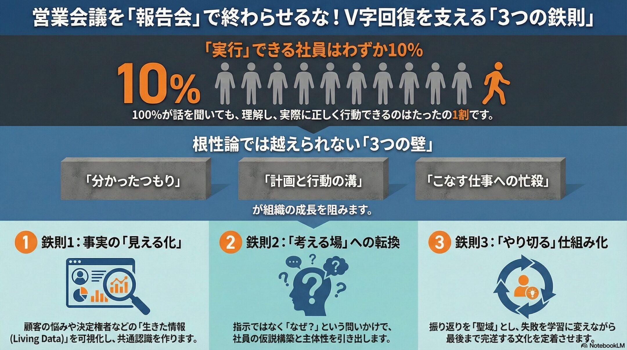 社員の「わかりました」に騙されるな!V字回復を支える「3つの鉄則」 あなたは、毎週月曜日の朝、どんな気持ちで会議室のドアを開けているでしょうか。 「今日もまた、先週と同じ言い訳を聞かされるのか……」 「数字の確認だけで1時間…