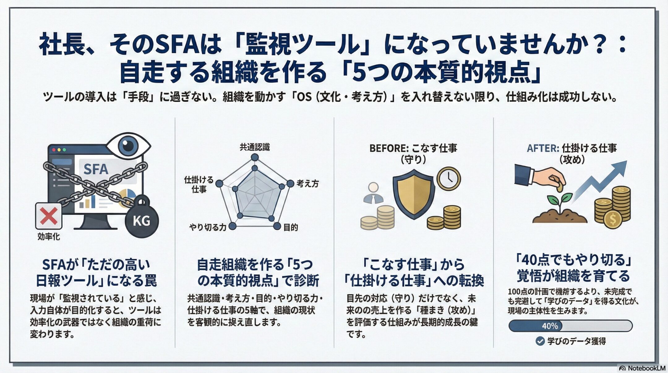 はじめに:社長、その「信頼」が組織の成長を止めていませんか? 「うちのエースが辞めたら、売上の3割が吹き飛ぶ……」 「数百万かけて導入したSFA(営業支援システム)が、今やただの高い日報入力ツールになっている」 「社員に『わかったか?』と…