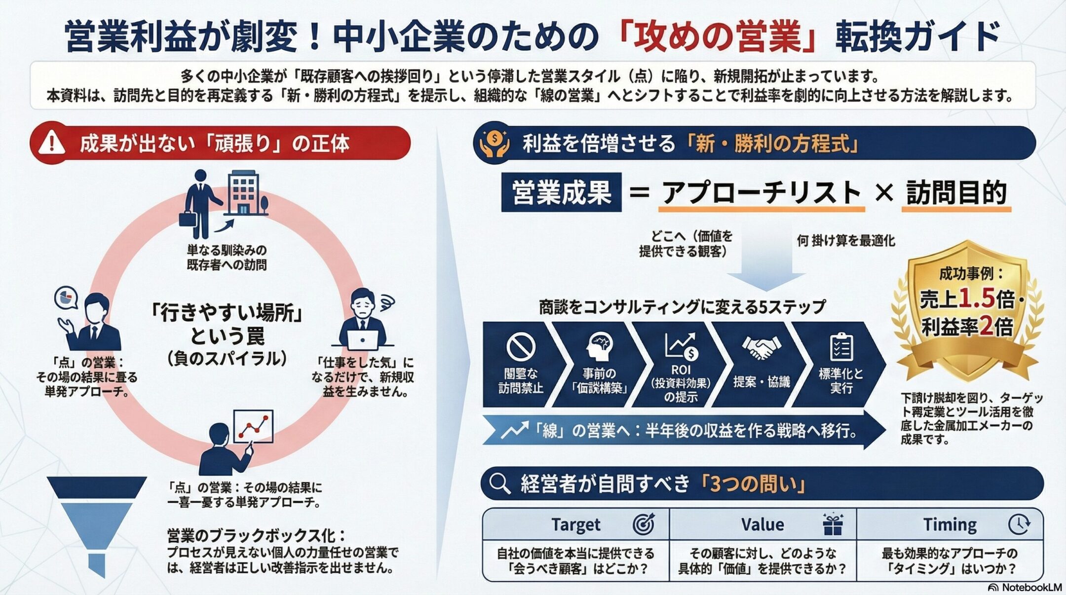 「うちの営業担当は皆、毎日遅くまで汗をかいて頑張っています。でも、なぜか数字がついてこないのです……」 多くの中小企業経営者から、私はこの悲痛な叫びを聞かされてきました。 営業担当者は毎日クタクタになるまで外を回り、報告書には「誠心誠意…