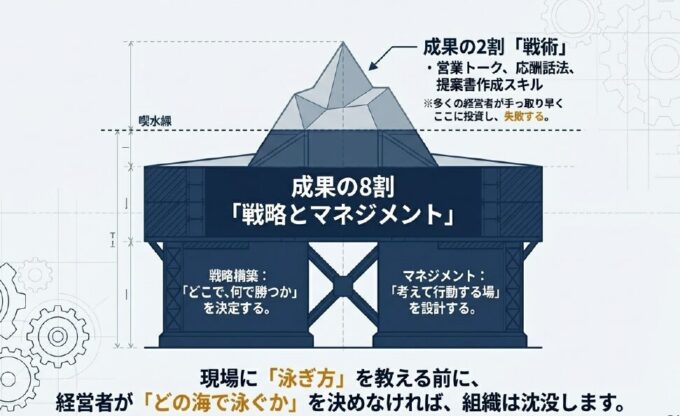 現場に「泳ぎ方(トーク術)」を教える前に、経営者が「どの海で泳ぐか(戦略)」を決め、嵐に巻き込まれない「環境(マネジメント)」を整えなければ、組織は沈没するだけです 。