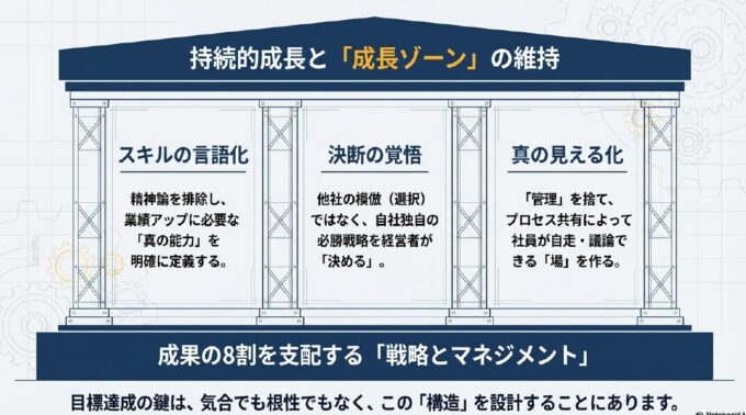 3. スキルの言語化: 「営業トーク」ではなく、「課題ヒアリング力」と「顧客の製造プロセス理解」を重点強化スキルとして定義し、上司がそのプロセスをサポートするように変えました 。