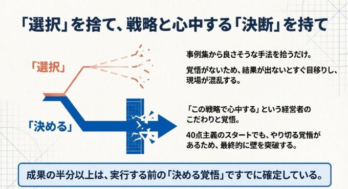• 「決める」: 「この戦略で心中する」という、経営者のこだわりと覚悟です 。たとえ40点主義のスタートでも、やり切ると決めているため、最終的に突破します 。