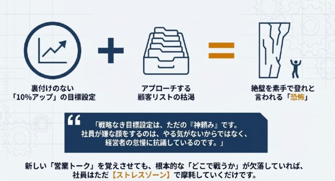 コンサルタント:「戦略なき目標設定は、ただの『神頼み』です 。社員が嫌な顔をするのは、やる気がないからではなく、経営者の怠慢に抗議しているのです。」