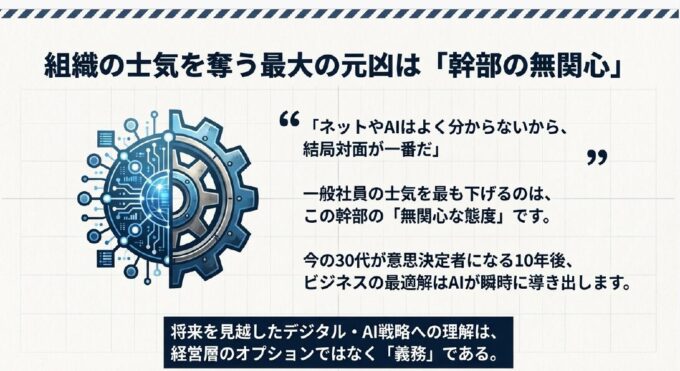 特にデジタル戦略やAI活用に対し、「ネットはよく分からないから対面が一番だ」と無関心を装うことは、もはやご法度です 。