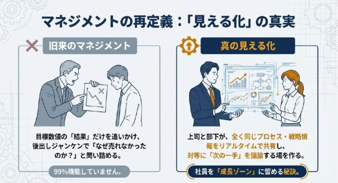 • 旧来のマネジメント: 結果(数字)だけを追いかけ、行動を縛る 。