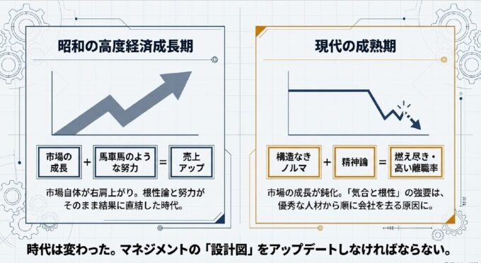 昭和の高度経済成長期であれば、市場そのものが右肩上がりだったため、馬車馬のように働けば売上は上がりました 。