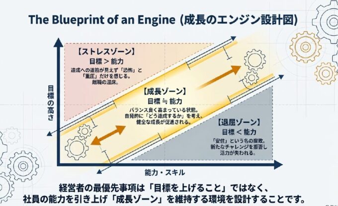 目標を上げると同時に、社員の能力・スキルを引き上げ、「成長ゾーン」を維持し続ける環境を設計することです 。