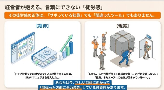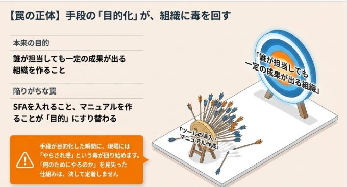 コンサルタント:「それが、落とし穴の正体です。属人化の脱却は、あくまで手段です。本当の目的は『誰が担当しても一定の成果が出る組織を作ること』のはず。ところが多くの会社では、SFAを入れること・マニュアルを作ることが目的化してしまっています。手段が目的化した瞬間に、現場には『やらされ感』という毒が回り始めるのです」