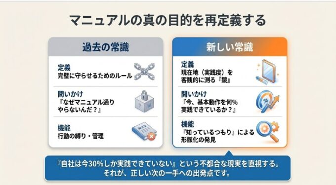 本来、マニュアルや仕組みの真の目的は、自社の現在地を客観的に測るための「鏡」です。