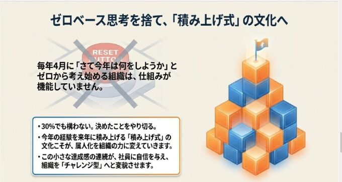 今年の経験を来年に積み上げる「積み上げ式」の文化こそが、属人化を組織の力に変えていきます。