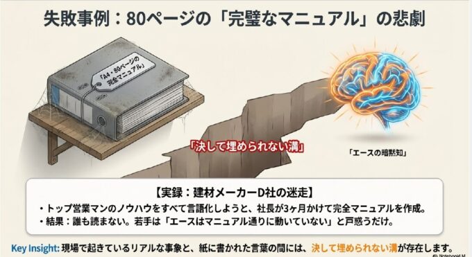 あなたの会社は、「属人化脱却」という正しい目標を掲げながら、 間違った方向に全力疾走している可能性があります。ツールを入れた。研修もやった。マニュアルも整備した。それなのに、なぜ現場は変わらないのか。