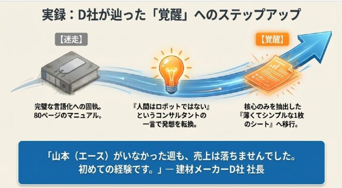 D社長は毎週末、山本の商談に同行し、その言葉を一言一句書き取りました。3ヶ月かけて完成したのは、A4で80ページを超える「営業完全マニュアル」。