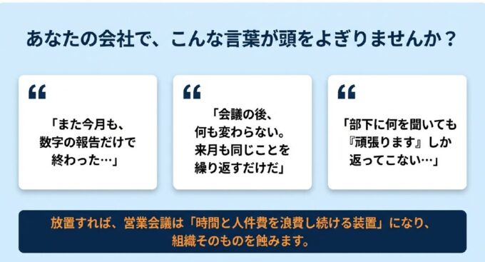 放置すれば、あなたの会社の営業会議は「時間と人件費を浪費し続ける装置」になり、やがて組織そのものを蝕んでいきます。