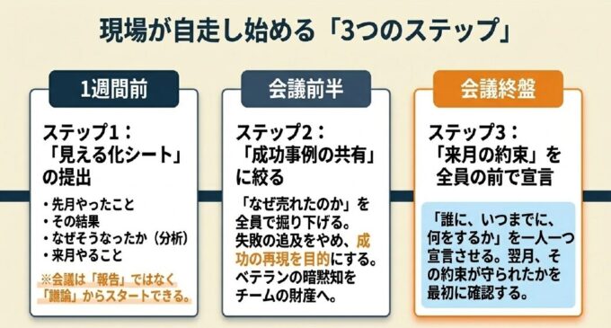 「次の営業会議で、一人一つ『成功事例』を話させる場をつくる」