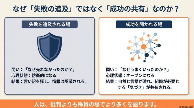「なぜ売れなかったか」を追及される場では、担当者は防衛的になります。