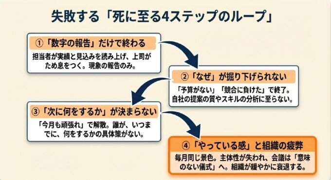 形骸化した営業会議は、じわじわと組織を蝕んでいきます。そのプロセスを4つのステップで描いてみます。