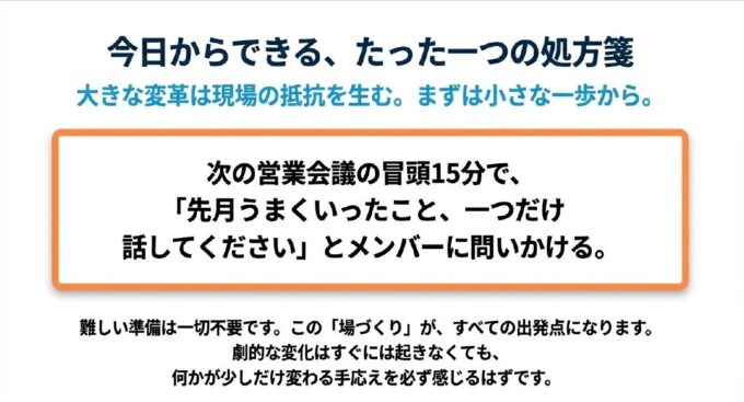 難しいことは何もありません。会議の冒頭15分を使い、メンバーに「先月うまくいったこと、一つだけ話してください」と問いかける。それだけです。