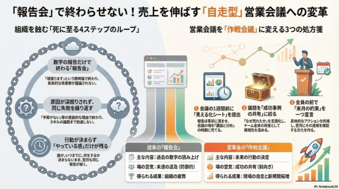 営業会議が報告会になっていると感じているなら、それはあなたの組織が「次のステージ」に進むサインです。