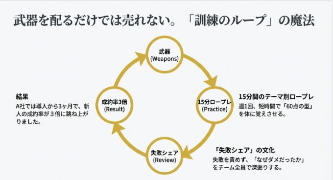 • 15分間の「テーマ別」ロープレ: 「今週は初回訪問のヒアリングのみ」など対象を絞り、60点の型を体に覚えさせます 。