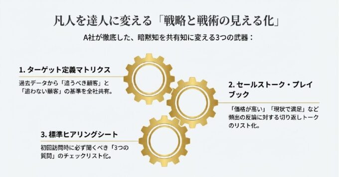 コンサルタント: 「そこが落とし穴です。凡人を達人に変える第一歩は、戦略と戦術の『見える化』です 。A社さんでは、まず以下の3つを徹底しました」