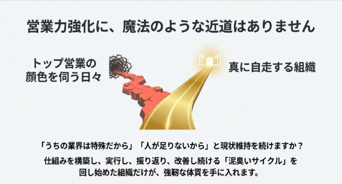 仕組みを構築し、実行し、振り返り、改善し続ける「泥臭いサイクル」を回し始めた組織だけが、強靭な体質を手に入れます 。