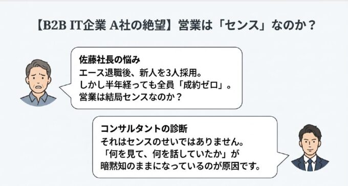 佐藤社長: 「うちのエースが辞めてから、売上がガタ落ちですよ。新人を3人入れましたが、半年経っても誰も1件も成約が取れない。やっぱり営業は『センス』なんですかね……」