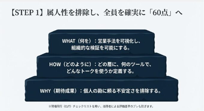 • WHY(期待成果): 個人の勘に頼る不安定さを排除し、再現性のある営業を実現するため 。