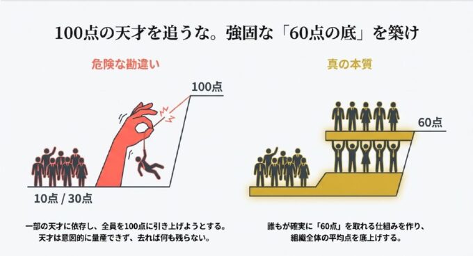 真の本質は、誰もが「60点(標準)」を確実に取れる仕組みを作り、組織全体の平均点を底上げすることにあります 。
