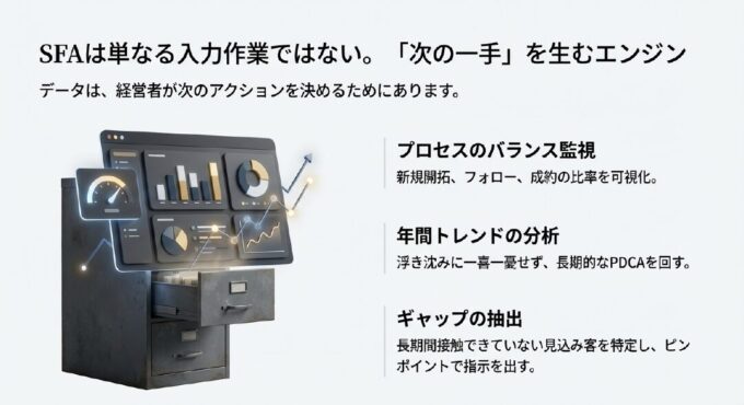 • ギャップの抽出: 「本来アプローチすべきだが、長期間接触できていない見込み客」をデータから特定し、ピンポイントで営業指示を出します 。