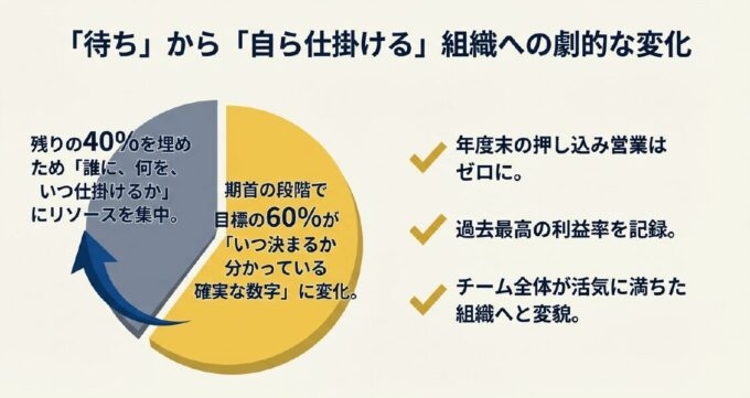 営業担当者は、残りの40%を埋めるために「誰に、何を、いつ仕掛けるか」に集中できるようになり、年度末の押し込み営業はゼロに。