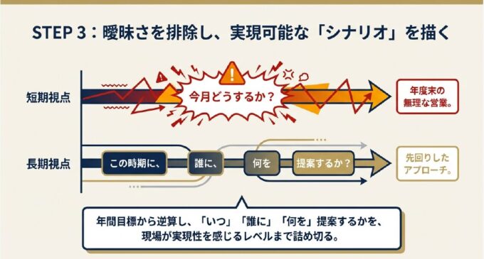 年間目標から逆算し、曖昧さを排除したアクションプランを作成します。