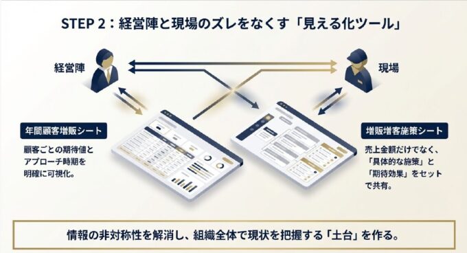 その上で、経営陣と営業担当者が「どの顧客に、いつ、どんな潜在課題を解決する提案を行うか」を言語化した「年間顧客増販シート」を作成しました。