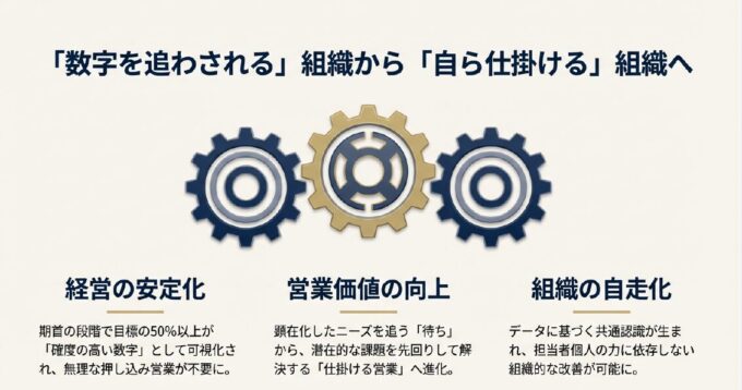 • 経営の安定化: 期首の段階で目標の50%以上が「確度の高い数字」として可視化され、無理な押し込み営業が不要になります。