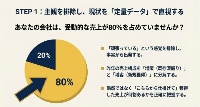 • その中で、偶然ではなく「こちらから仕掛けて」獲得した売上は何割ありましたか? 多くの企業では、受動的な売上が80%を占めている現実に驚かされます。