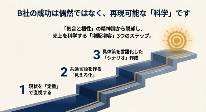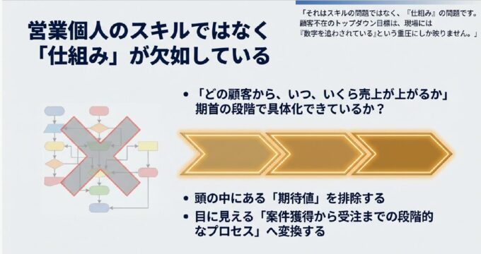 コンサルタント:「それは営業担当者のスキルの問題ではなく、『仕組み』の問題かもしれません。
