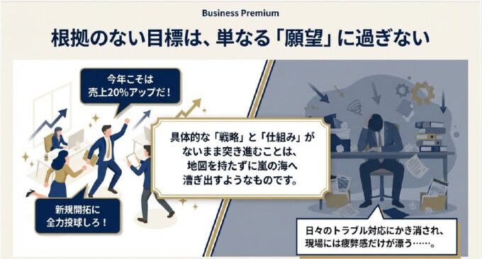 具体的な「戦略」と「仕組み」がないまま突き進むことは、地図を持たずに嵐の海へ漕ぎ出すようなものです。