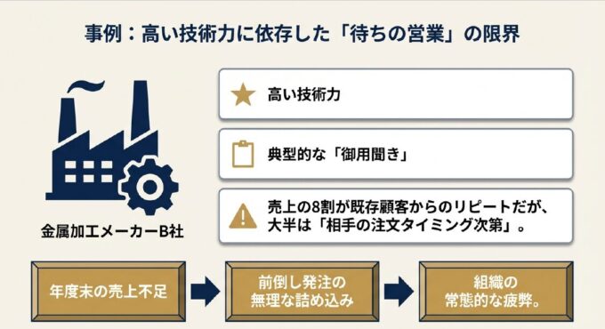 B社は長年、高い技術力を武器にしてきましたが、営業スタイルは典型的な「御用聞き」でした。