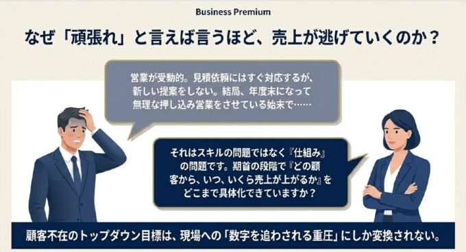 コンサルタント:「それこそが『負の連鎖』の入り口です。 顧客不在のトップダウン目標は、現場には『数字を追わされている』という重圧にしか映りません。