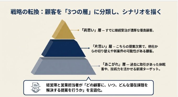 • 「あこがれ」層: 過去に取引があった休眠客や、技術力を活かせる新規ターゲット。