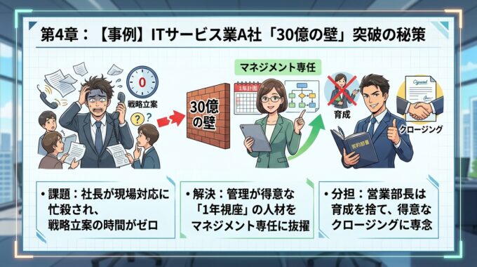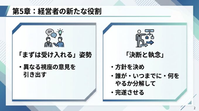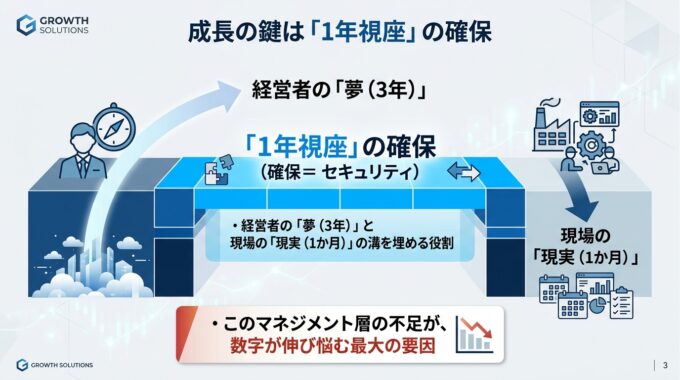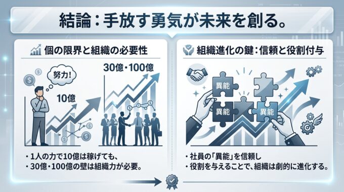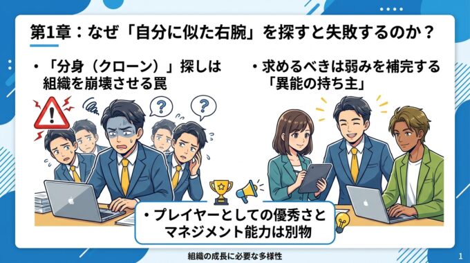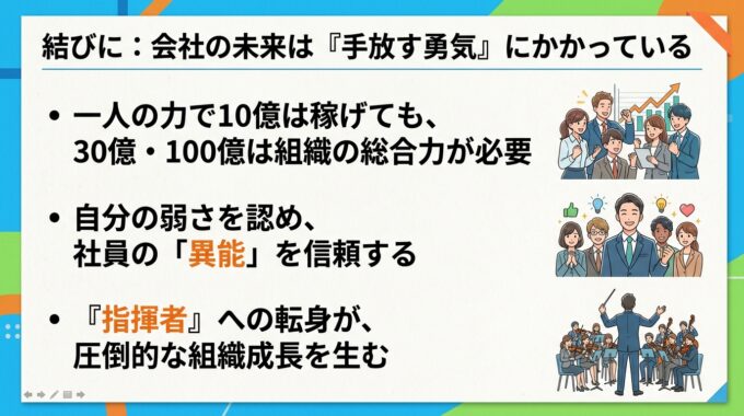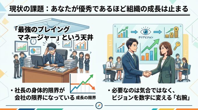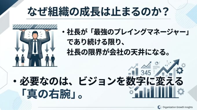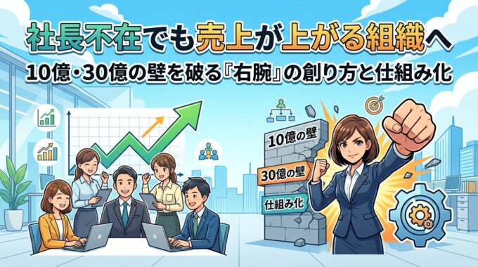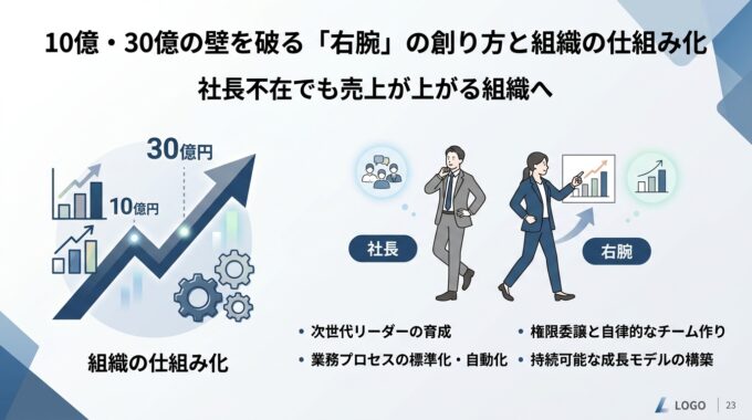 参考までに、第461話のコラム記事「社長不在でも売上が上がる組織へ:10億・30億の壁を破る右腕の作り方と仕組み化」をナノバナナ 2 で作成したスライドを以下に記しておきます。