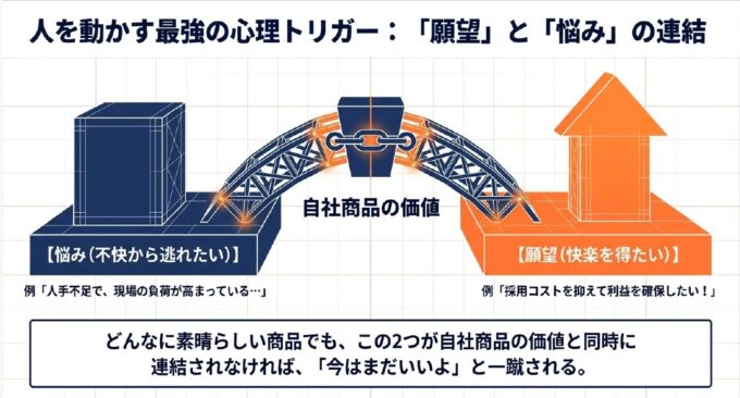 貴社の営業担当者は、自社商品の価値を顧客の「悩み」と「願望」の双方に明確に連結できていますか?