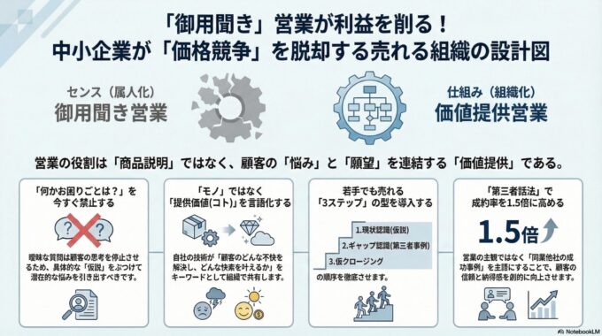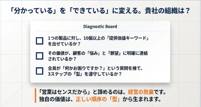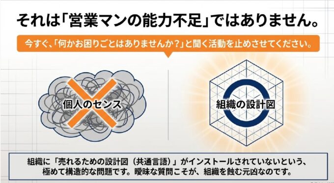 組織全体に「売れるための設計図(共通言語)」がインストールされていないという、極めて構造的な問題なのです 。