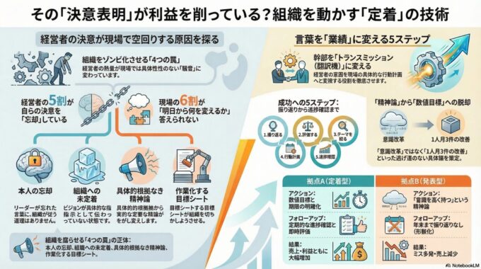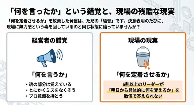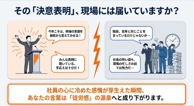もし、社員の心の奥底にそんな冷めた感情が 1 ミリでも芽生えているとしたら、あなたの決意表明は「組織を動かす力」を失い、逆に現場のやる気を削ぐ「徒労感」の源泉へと成り下がっています 。