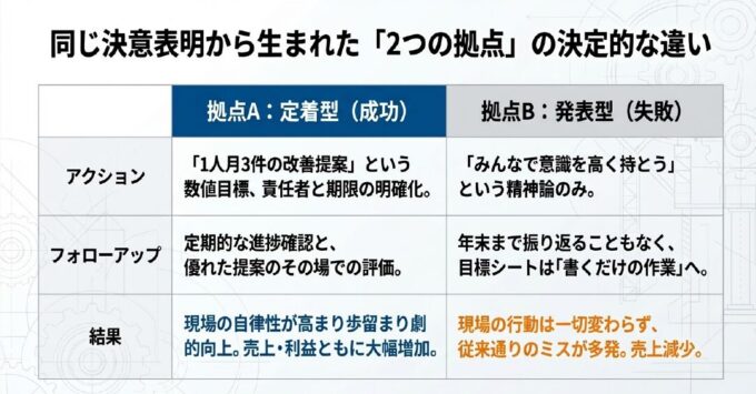 一方、拠点Bは「社長のいい話を聞いた」という一時的な感情で終わりました 。