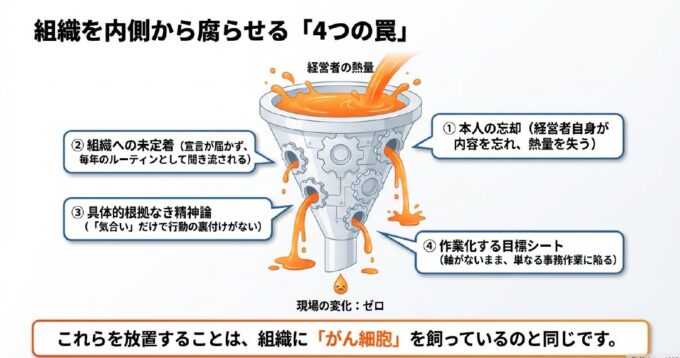 なぜ、これほどまでに決意は届かないのか。そこには、組織を内側から腐らせる4つの罠が潜んでいます。