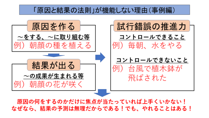 原因のこれだけをやればよいという方向性だけ決めて、結果、取組みが中途半端になれば、失敗確立が高まるということです。なぜなら、コントロールできることとできないことの確率は半々だからです。